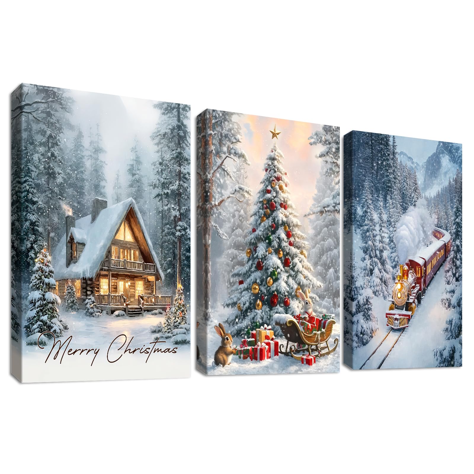 3Pcs Weihnachten Roter Zug Leinwand Bilder Set Mit Rahmen Winter Holzhaus Bild auf Leinwand Malerei Schlitten Geschenke Wandbilder Wohnzimmer Schlafzimmer Esszimmer Feiertage Wanddeko 40x60cm x3pcs Roter Zug 40L x 60B cm