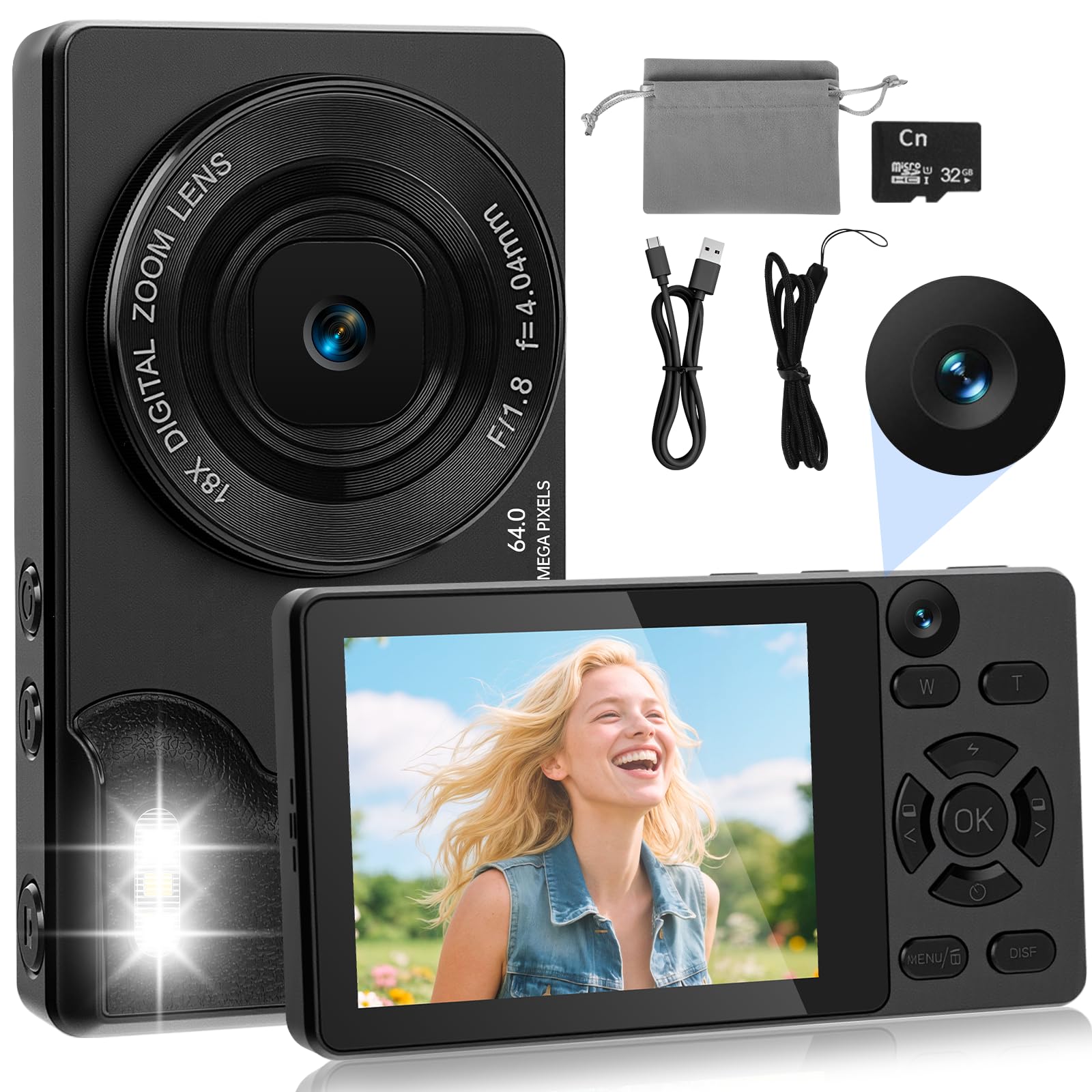4K 64MP Digitalkamera mit Dual-Kameras Vorne und Hinten, Autofokus Kamera Fotokamera Kompakte Vlogging Kamera 2,8 Zoll Bildschirm, 18X Digitalzoom, 32G Karte für Kinder, Jugendliche, Anfänger