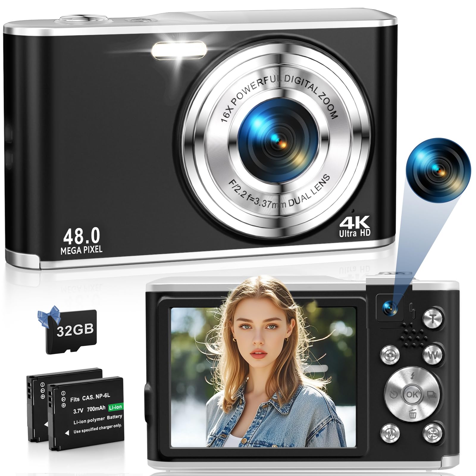 4K Digitalkamera 48MP Autofokus Kompaktkamera mit Dual Front- und Rückkameras Vlogging, YouTube für Fotografie, 16X Digitalzoom mit 32GB TF-Karte & 2 Batterien - Schwarz black