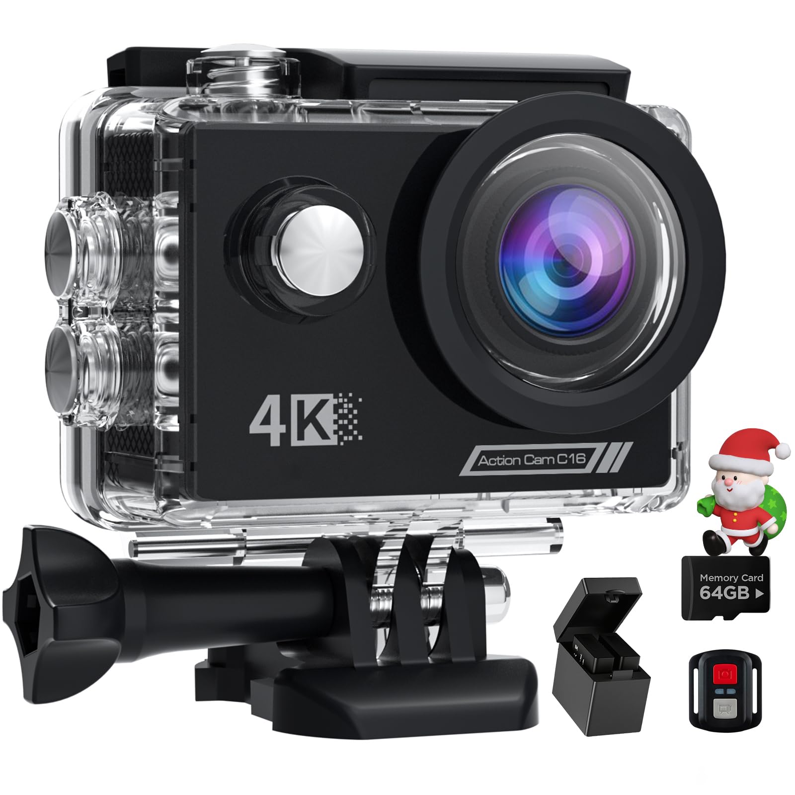 4K60 fps Action Cam mit 64G SD Card, 40M Unterwasserkamera WiFi 170° Helmkamera HD 64MP Wasserdicht Actionkameras EIS mit 2.4G Fernbedienung 2* Akkus actioncam Zubehör Kits