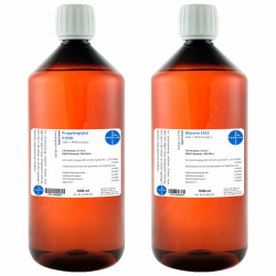 Sie erhalten: 1 x 1000 ml Glycerin E422 Vol%: >99,9% + 1 x 1000 ml Propylenglykol E1520 Vol%: >99,9% zur Herstellung von Cremes, Lotionen, Gels, Balsam I Höchste pharmazeutische Qualitätsstufe! I Lebensmittelzertifizierung: PET-Flasche/braun, KSV-OV.