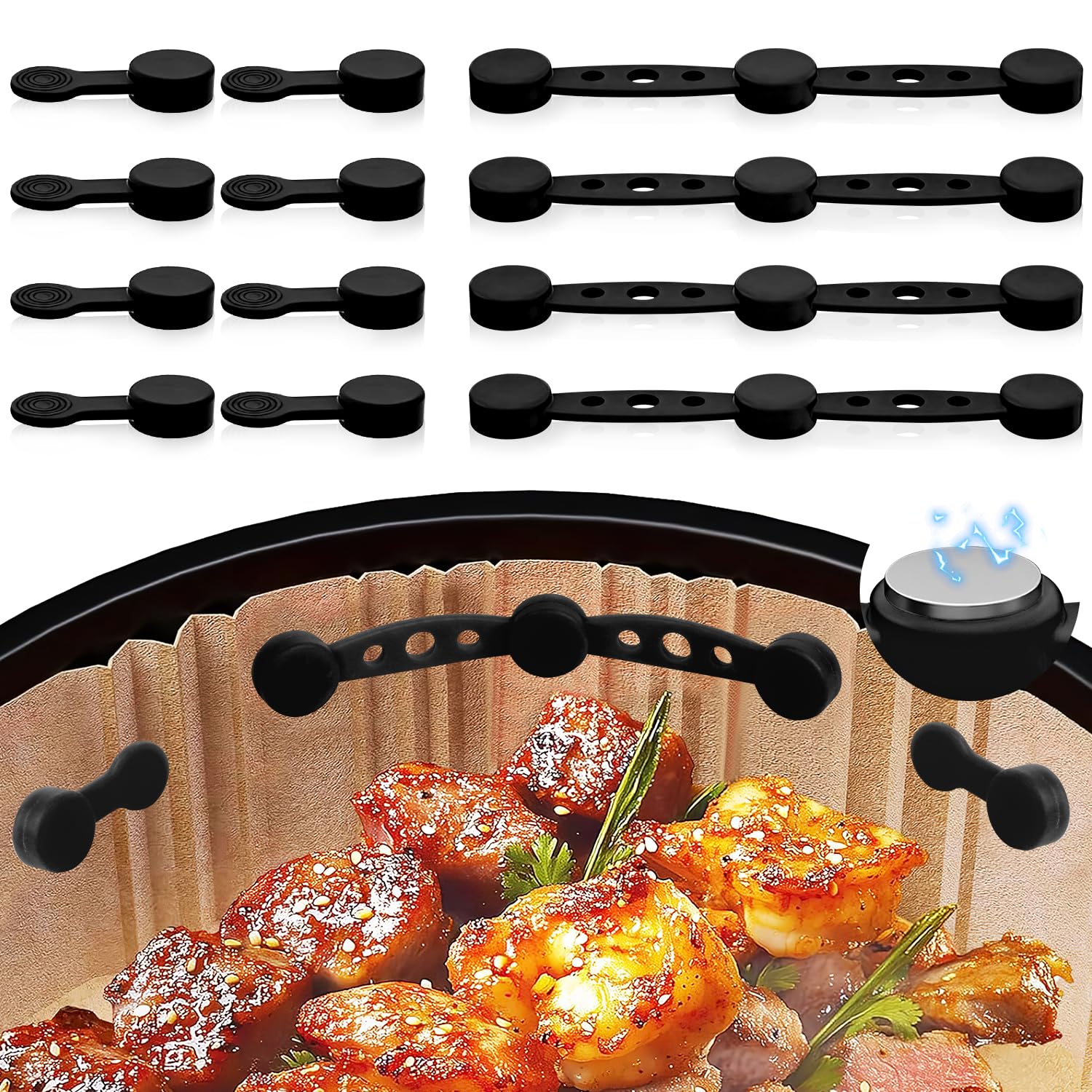 SICHERE BEFESTIGUNG: Magnetclips Airfryer des Air fryers sorgt dafür, dass Ihr Pergamentpapier fest an Ort und Stelle bleibt, unerwünschte Bewegungen, die mit dem Heizelement in Kontakt kommen können, wodurch eine sicherere Kochumgebung geschaffen wird,Sie erhalten 4 lange Silikonstreifen und 8 runde Silikonschnallen, die Größen betragen 0,4 x 1,5 x 0.7 cm bzw. 3,2 x 1,5 x 0.7 cm