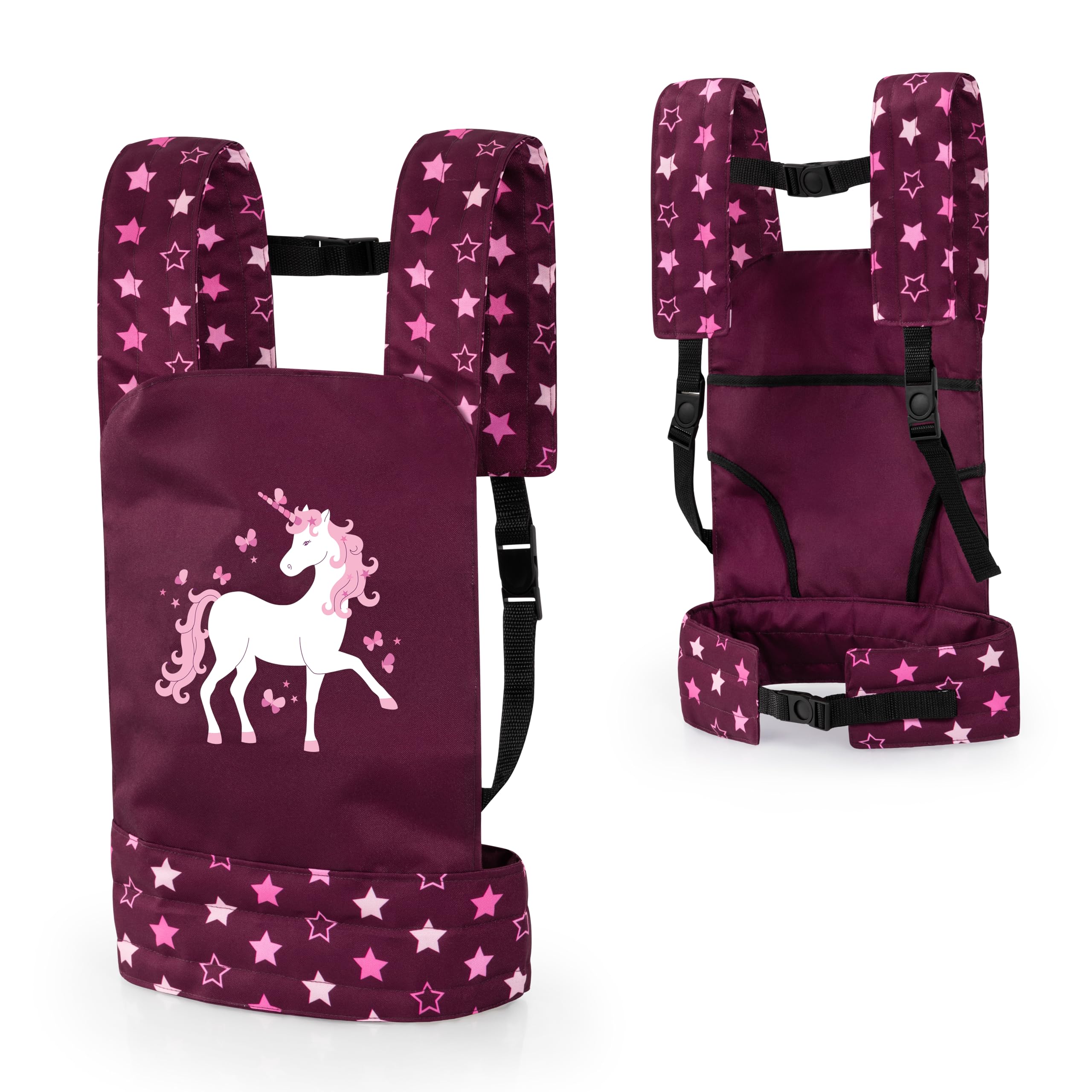 Bayer Design 62223AA Puppentrage EasyCarry, gepolstert, verstellbare Riemen, hinten und vorne tragbar, für Puppen und Plüschtiere, Bordeaux, Rosa, Einhorn