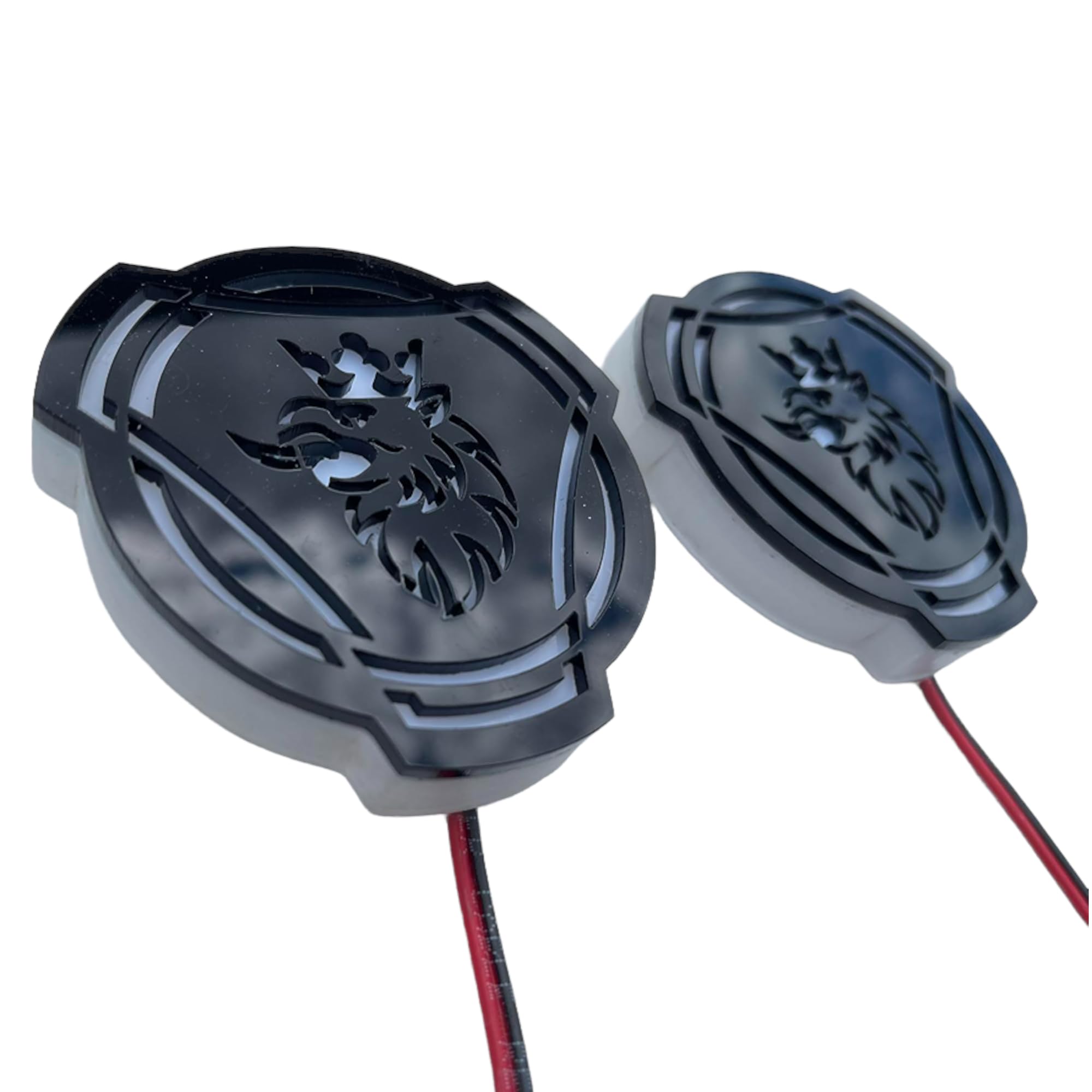 Hochwertiges beleuchtetes Logo: Aus Plexiglas gefertigt, mit 24V betrieben, kaltweißes Licht, Abmessungen 83x80x15mm, Montage mit 2 M6-Gewindeschrauben.