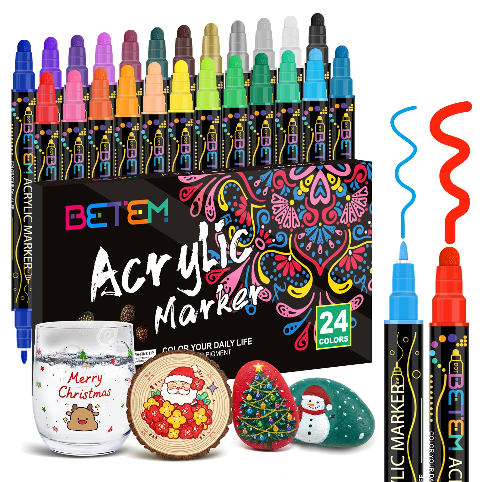 Betem 24 Farben Acrylstifte mit Doppelspitze, Hochwertige Acrylmarker für Stein, Holz, Leinwand, Felsmalerei, Glas, Keramik Wasserfest, Christmas Acrylstifte Set für Basteln Kunstbedarf 24 Farben Lackmarkierungen