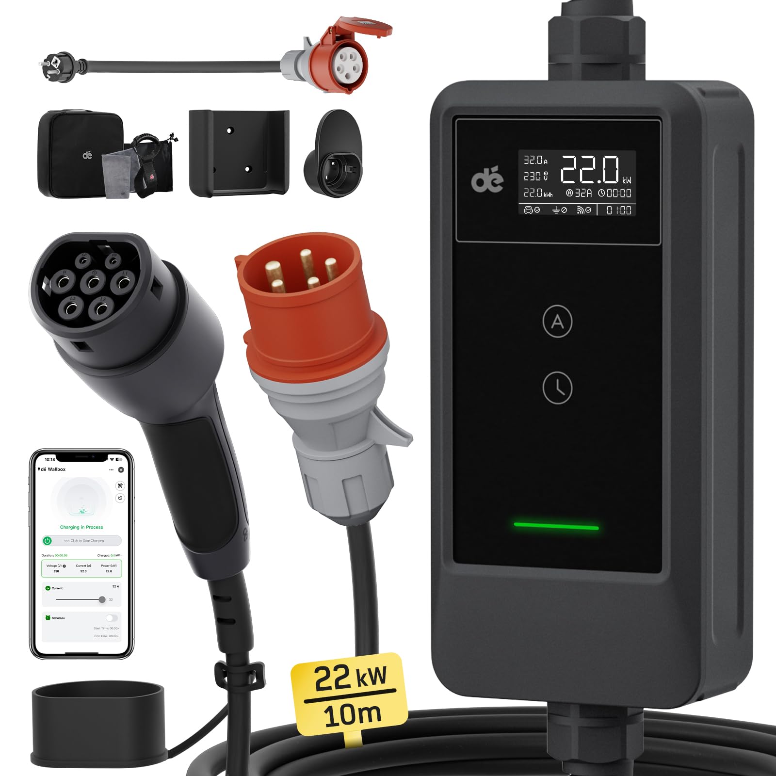 ăMobile Wallbox 22kW â Plug & ChargeăKein komplizierter Installationsprozess erforderlich. Einfach an eine vorhandene CEE 32A Steckdose anschlieĂen und sofort bis zu 22 kW Ladeleistung nutzen. Ideal als stationĂ€re Wallbox fĂŒr Zuhause oder am Arbeitsplatz sowie als tragbares LadegerĂ€t fĂŒr unterwegs.ăSchnelles Laden mit 3-Phasen-StromăDank des 3-phasigen CEE 32A Steckers ermöglicht die mobile Ladestation eine maximale Ladeleistung von 22 kW (230V x 32A x 3) â bis zu 6-mal schneller als herkömmliche Haushaltssteckdosen mit 230V x 16A.ăNeu aktualisierte APP-Funktionenă Die Wallbox 22kw verfĂŒgt ĂŒber eine neue und verbesserte APP-Funktion, egal ob Sie es vorziehen, den Ladevorgang direkt am EV-Charger einzustellen oder den modernen Komfort einer speziellen mobilen App zu nutzen. Wir haben ein EV-LadegerĂ€t, das Ihren BedĂŒrfnissen und Vorlieben entspricht.ă2-IN-1-FunktionăKombiniert eine 22-kW-Wallbox mit einem 7 m langen Typ-2-Ladekabel. Spart Platz und zusĂ€tzliche Kosten fĂŒr ein separates Kabel. Mit 7 m LĂ€nge bietet es mehr FlexibilitĂ€t fĂŒr das Laden in der Einfahrt oder Garage.ăUmfassendes Zubehör fĂŒr mehr KomfortăIm Lieferumfang enthalten: 22-kW-Ladestation, wasserdichte Tasche, Tragegurt und Reinigungstuch. Die robuste Tasche schĂŒtzt das Kabel, wĂ€hrend der Tragegurt das Kabelmanagement erleichtert.ăBreite KompatibilitĂ€tăKompatibel mit den meisten Fahrzeugen mit Typ-2-Anschluss wie Zoe, EQ, i3, Spring, ID.3, ID.4, ID.5, e-Golf, e-Up, 500e, E-208, Model Y/3, E-Tech, XC40/C40, EV6, Ioniq 5/Kona, EQA, 500 Hybrid und anderen BEV/PHEV-Modellen.