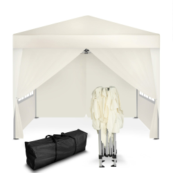 Kronenburg Faltpavillon DachmaĂ 3 x 3 m mit Scherensystem. 100 % WASSERDICHT - Dachbezug Polyester beschichtet, NĂ€hte versiegelt (getaped) mit UV-Schutz 50+. Farbe: Champagner mit 4 Seitenteilen (2 mit Fenster, 2 mit ReiĂverschluss) - Firsthöhe: ca. 2,50 m - Material: Stahlgestell grau lackiert. Zubehör: Tragetasche, 4 Abspannseile, 8 ErdspieĂe mit Aufbauanleitung. PackmaĂ: ca. 119 x 24 x 24 cm - Gewicht: 17 kg.