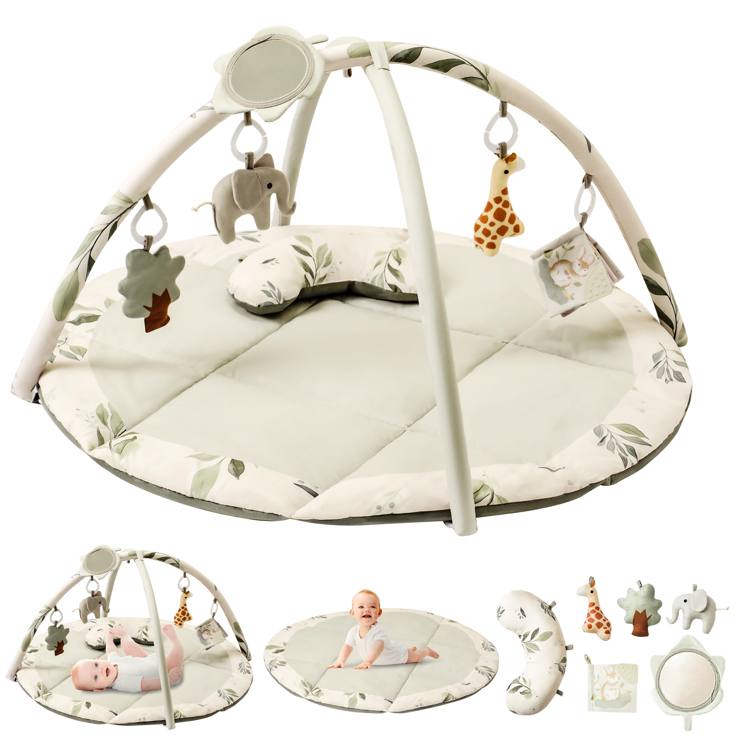 Fortella Spielbogen Baby, Spielmatte mit Bauchzeit Kissen und 5 Sensorik Spielzeug Abnehmbarem,Naturthemen Krabbeldecke für Babys ab der Geburt, Neugeborene & Kinder, 0-6-9-12 Monate-Salbeigrün