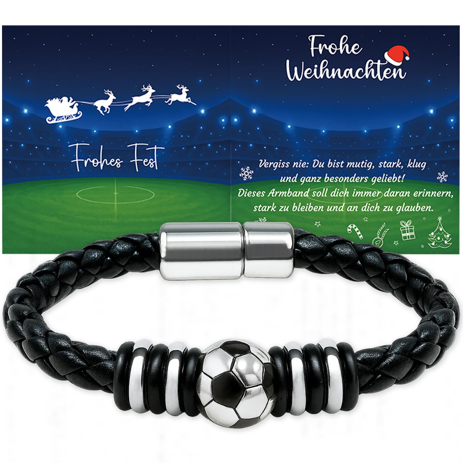 ⚽ Cooles Design – Geflochtenes Lederband kombiniert mit Edelstahl-Fußball und Magnetverschluss. Robust, angenehm zu tragen und ideal als tägliches Accessoire für Teenager und Kinder.