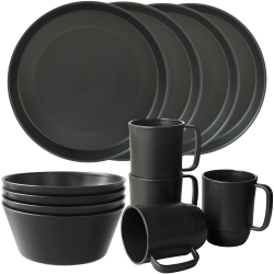 Geschirrsets aus Kunststoff | Leichtes und Unzerbrechliches Komplett-Set,ideal für Erwachsene Wiederverwendbar,Tellerset, Schüsseln,Tassen,Tafel-Service für 4 Person 12pcs-rund-schwarz