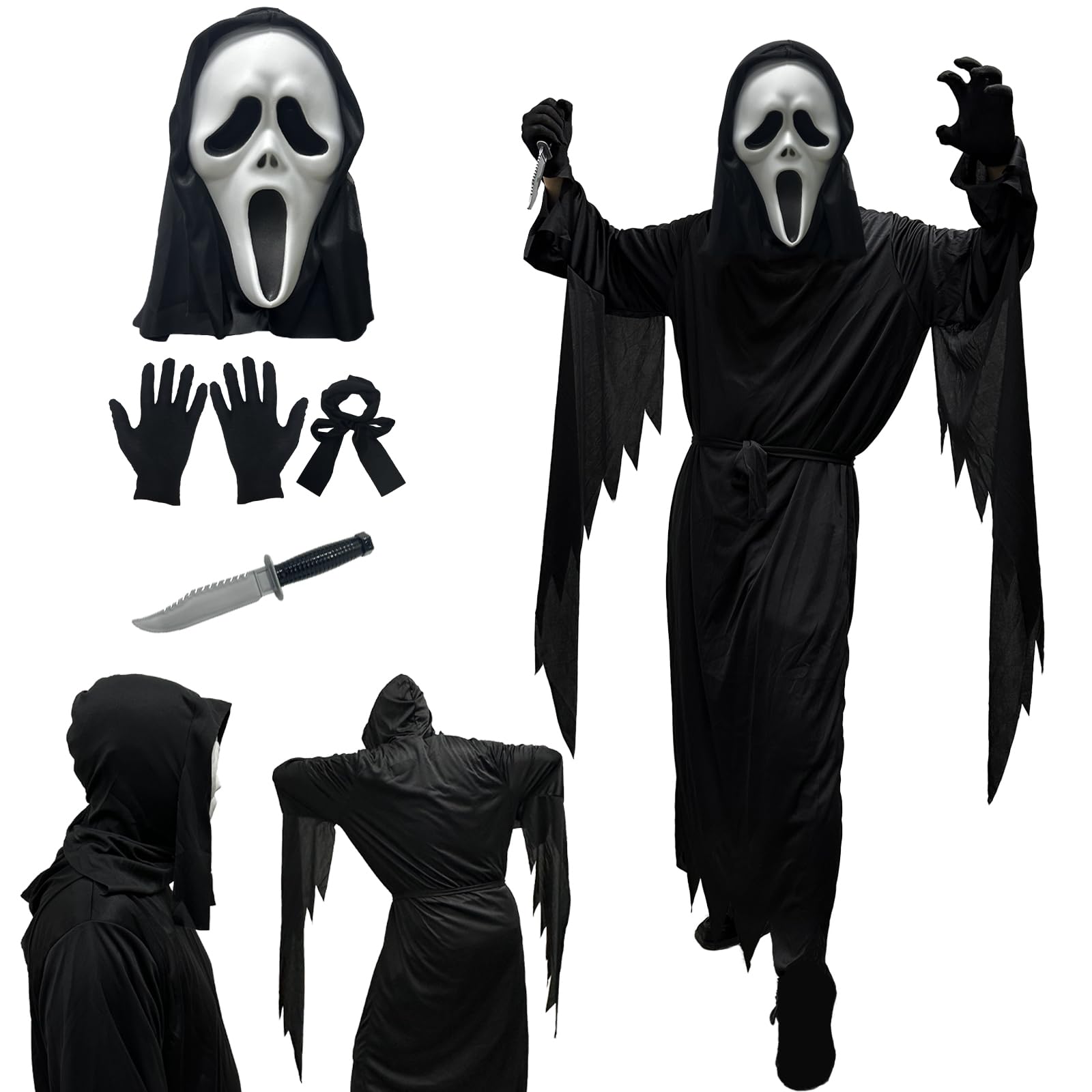 【Super Value Pack für Rollenspiele】Beinhaltet einen Kapuzenmantel mit Drapierärmeln, Ghost-Gesichtsmaske und Gürtel Inklusive schwarzer Handschuhe und Messer,Ideal für jede Geister- oder Halloween-Motto-Party oder Teenager-Kostüm