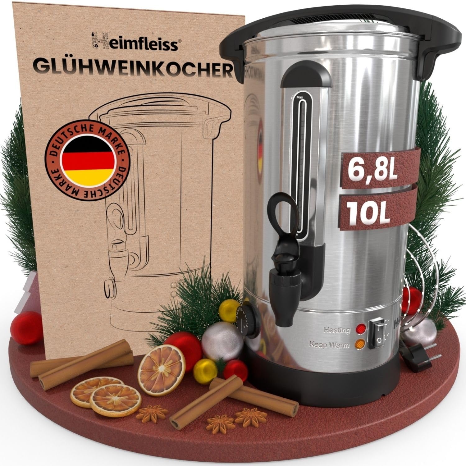 Heimfleiss® Glühweinkocher 10L aus Edelstahl | 1500W Einkochautomat für Glühwein, Punsch & Kakao | Glühweintopf mit Zapfhahn, Thermostat & Überhitzungsschutz | Heissgetränkespender Heißgetränkeautomat 10 Liter Silber