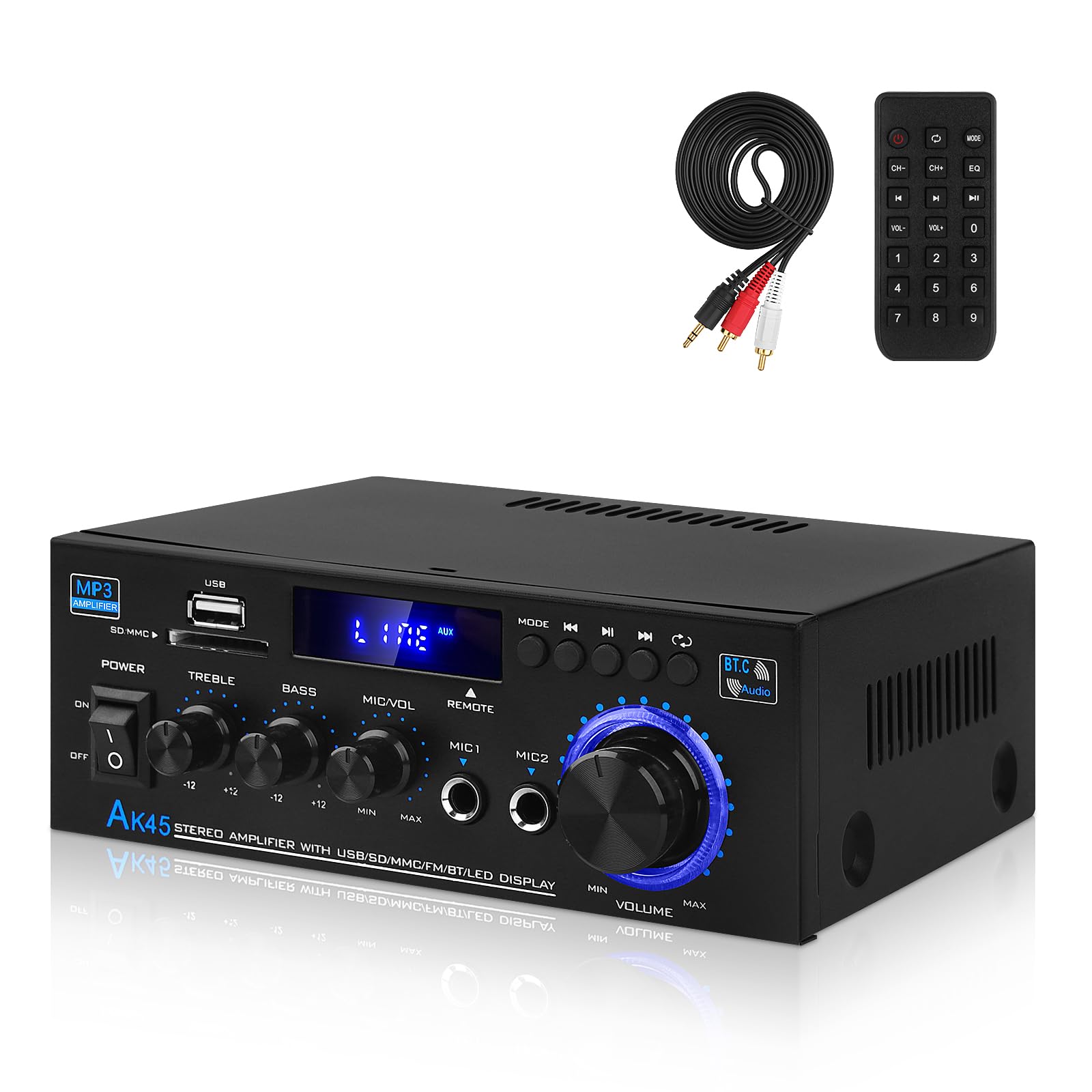 HiFi Verstärker mit Bluetooth, Mini Stereo Audio Amplifier Anlage 2.0 Kanäle 400W X 2 Endverstärker mit FM-Radio, BT, MIC, SD/USB-Eingang, Audiokabel für Heimkino Lautsprecher AK45