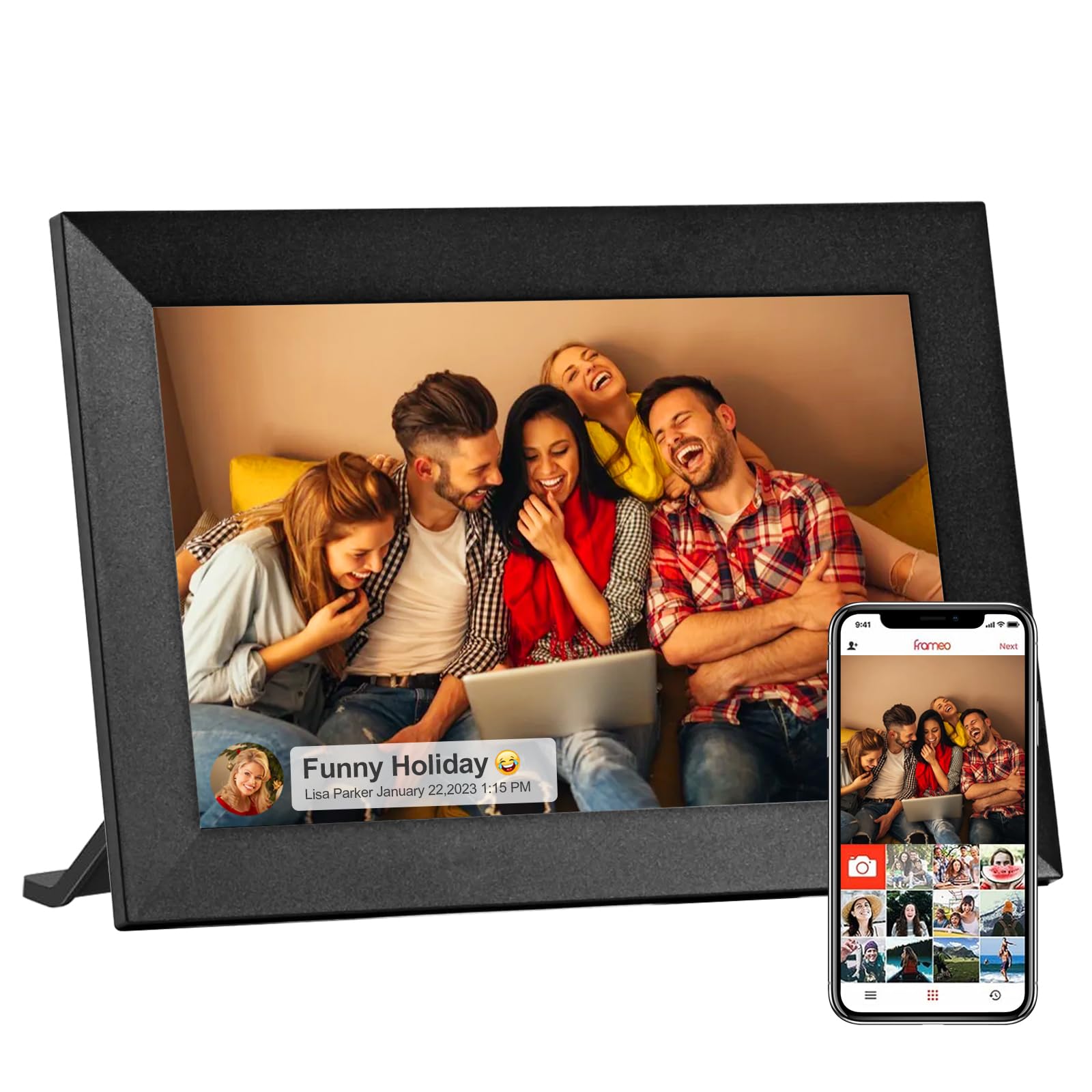 【Ferngesteuertes Cloud-Management und Teilen】Sie können mit der Frameo App Fotos an angeschlossenen Fotorahmen senden, nicht nur das Hochladen von neuen Fotos ist jederzeit und überall möglich, fügen Sie dem Foto eine Bildunterschrift hinzu, sondern Sie können auch besondere Momente mit Familie und Freunden teilen. Dadurch wird eine Echtzeit-Aktualisierung ermöglicht und die Nähe zu Ihren Lieben bleibt erhalten.