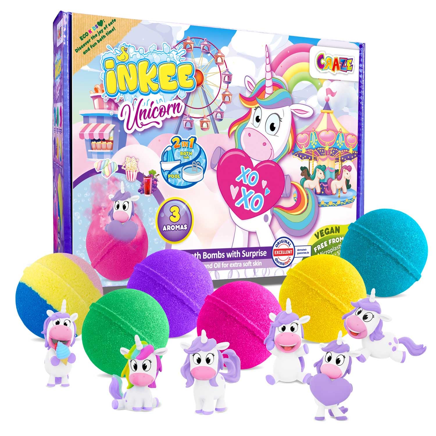 INKEE Geschenkbox Unicorn | Box mit 6 Badebomben für Kinder mit Überraschung, 6 Badekugeln mit Einhornfiguren in 6 verschiedenen Farben Einhorn Badebomben Geschenkset