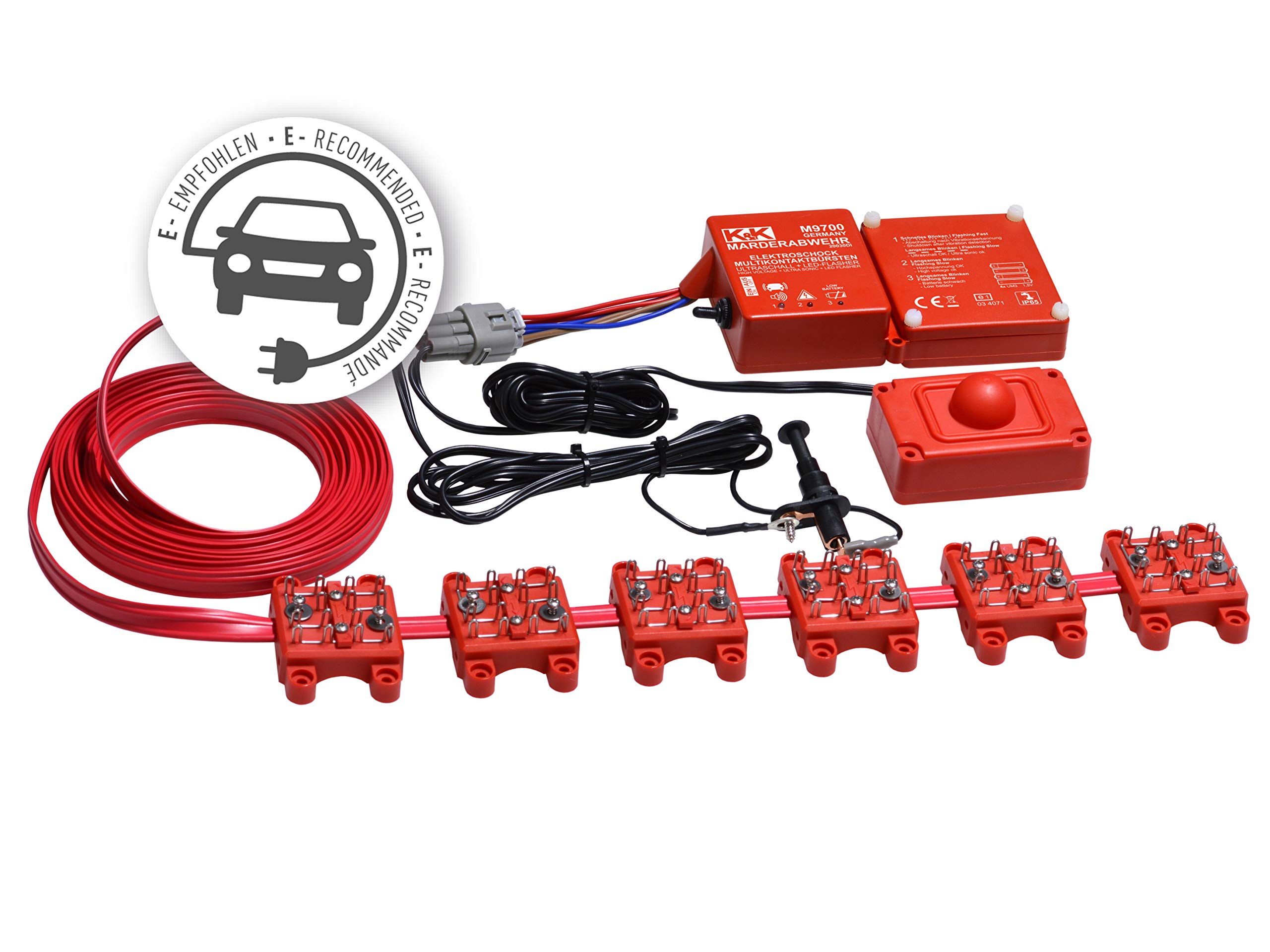 K&K M9700 - Das AUTARKE Marderabwehrgerät: Marderabwehr Ultraschall + Hochspannung (autark) batteriebetrieben, wasserdicht, 6 verschiebbare +/- Bürsten, 360°-Ultraschall, Sicherheitsmotorhaubenschalte