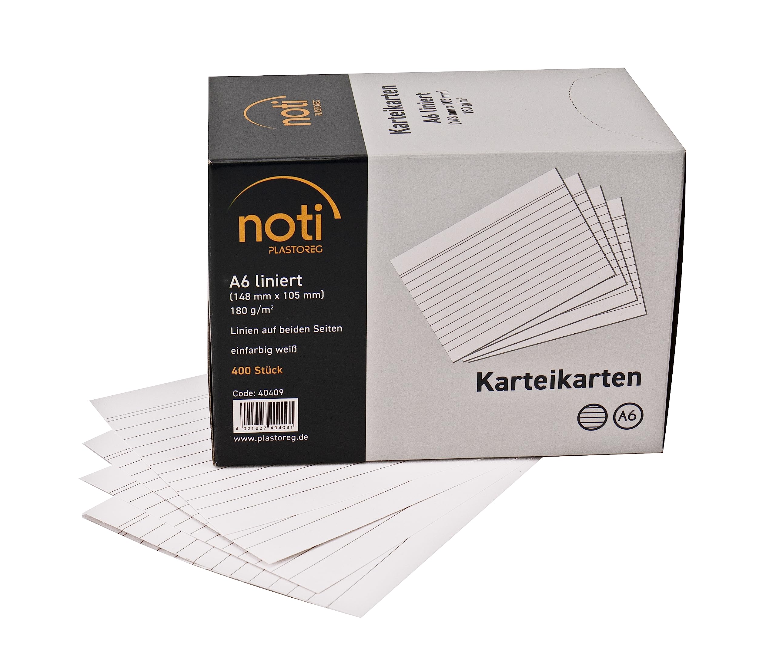 Karteikarten A6, 148 x 105mm liniert, weiß, 400 Stück in praktischer Spenderbox, für Vokabeln, als Lernkarten, Moderationskarten, Büro und Schule in 180g/m² weiß A6