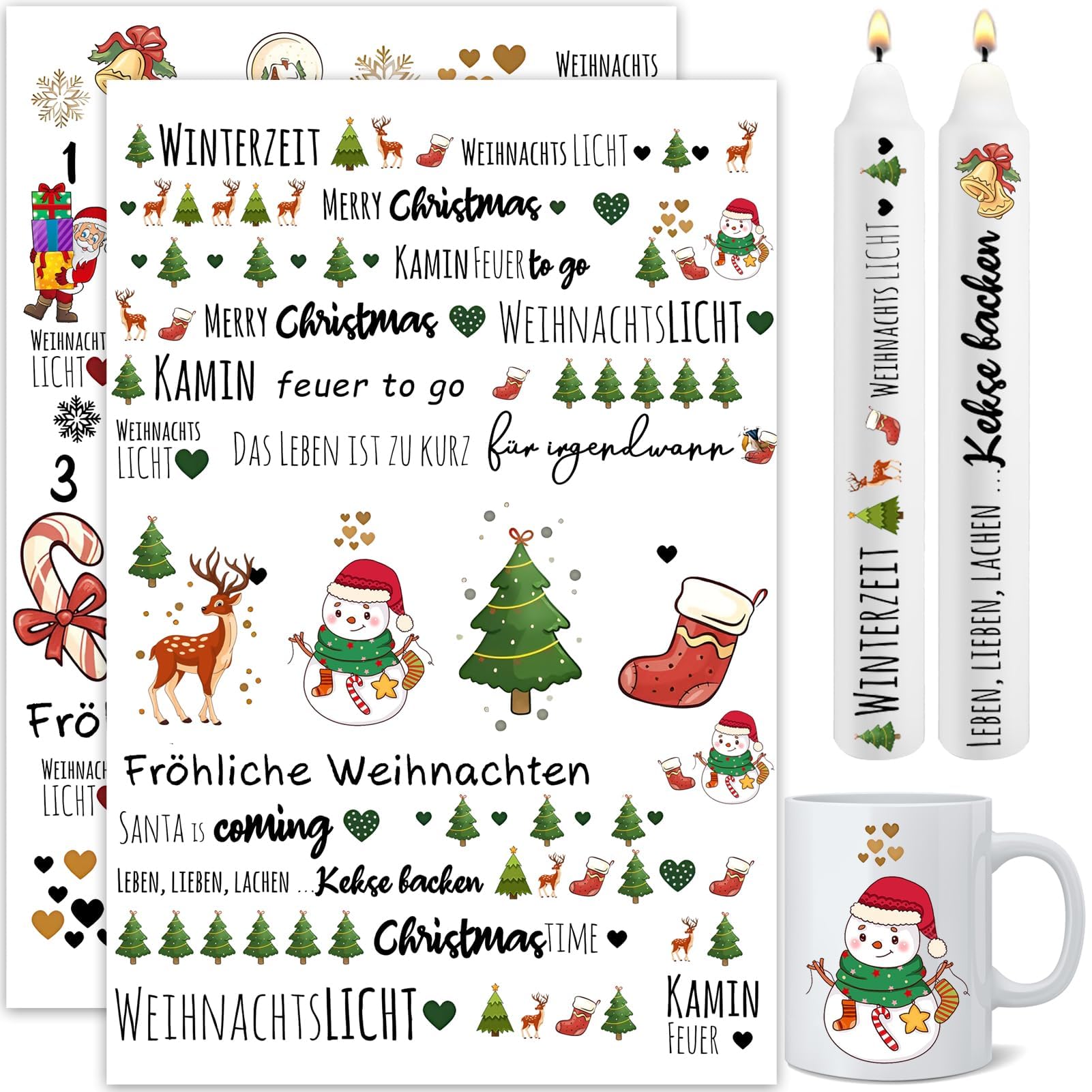 Kerzentattoos Weihnachten, Rub on Sticker Christmas, Kerzen Tattoo Folie Farbe DIY Kerzensticker für Adventskerzen und Keramik A4 Bogen DIY Stickerbogen