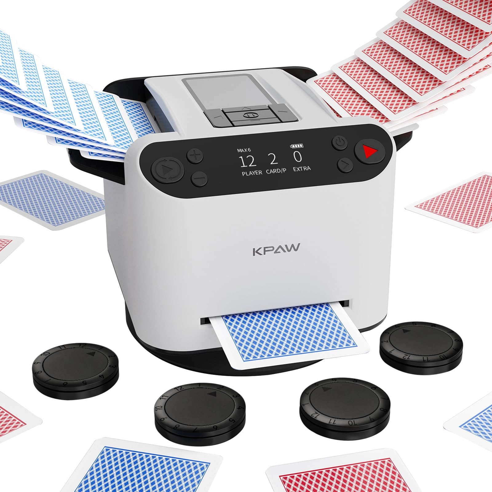 KPAW Kartenmischmaschine mit Austeilen, 360° Drehung für 1–2 Decks, mit 4 Fernbedienungen, Automatischer Kartenmischer und Austeiler Für 2–12 Spieler, Wiederaufladbar, Leise für Poker (Weiß)
