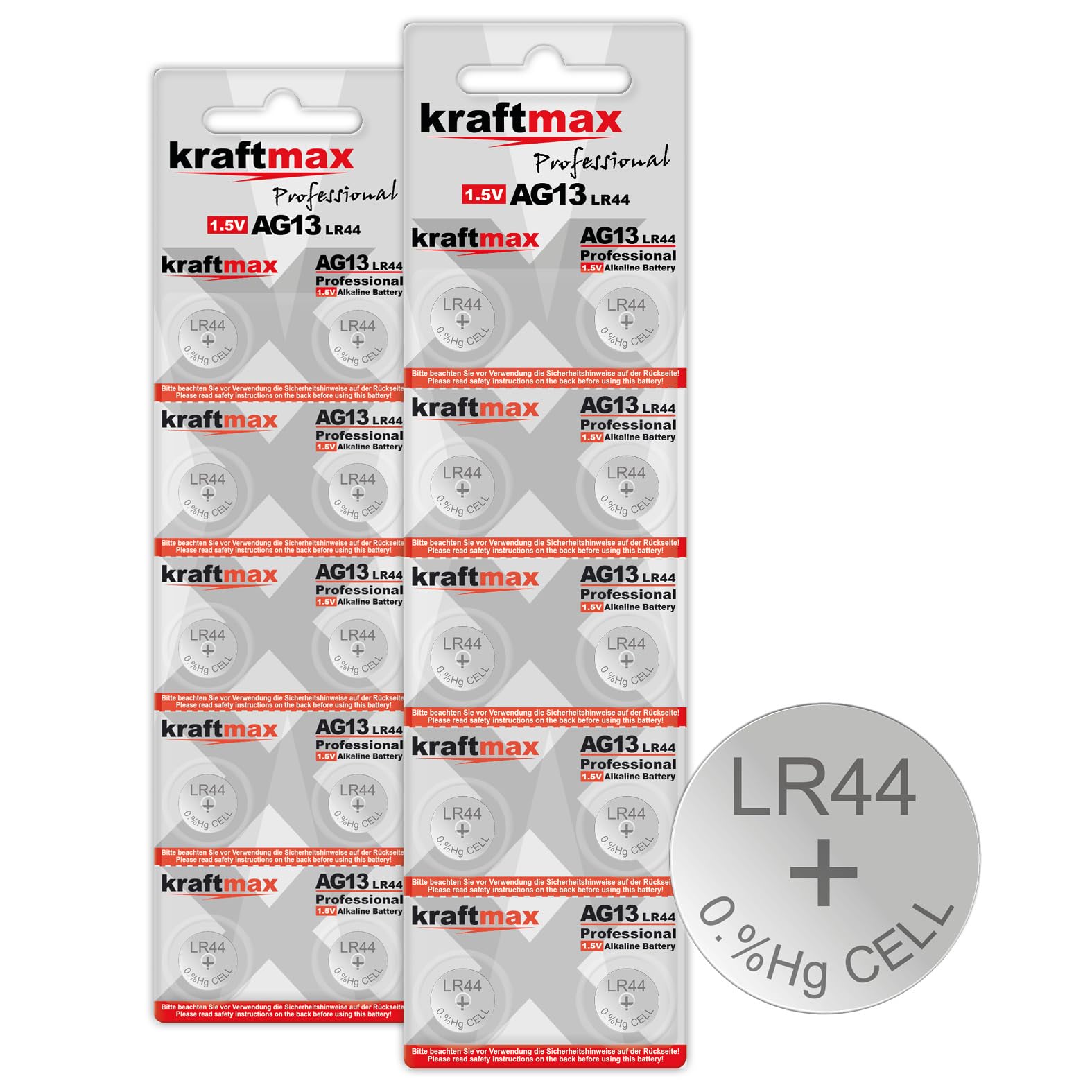 Kraftmax 20er Pack LR44 / AG13 Knopfzelle Typ 357 / LR1154 Hochleistungs- Batterie / 1,5V Uhrenbatterie/Alkaline Batterien