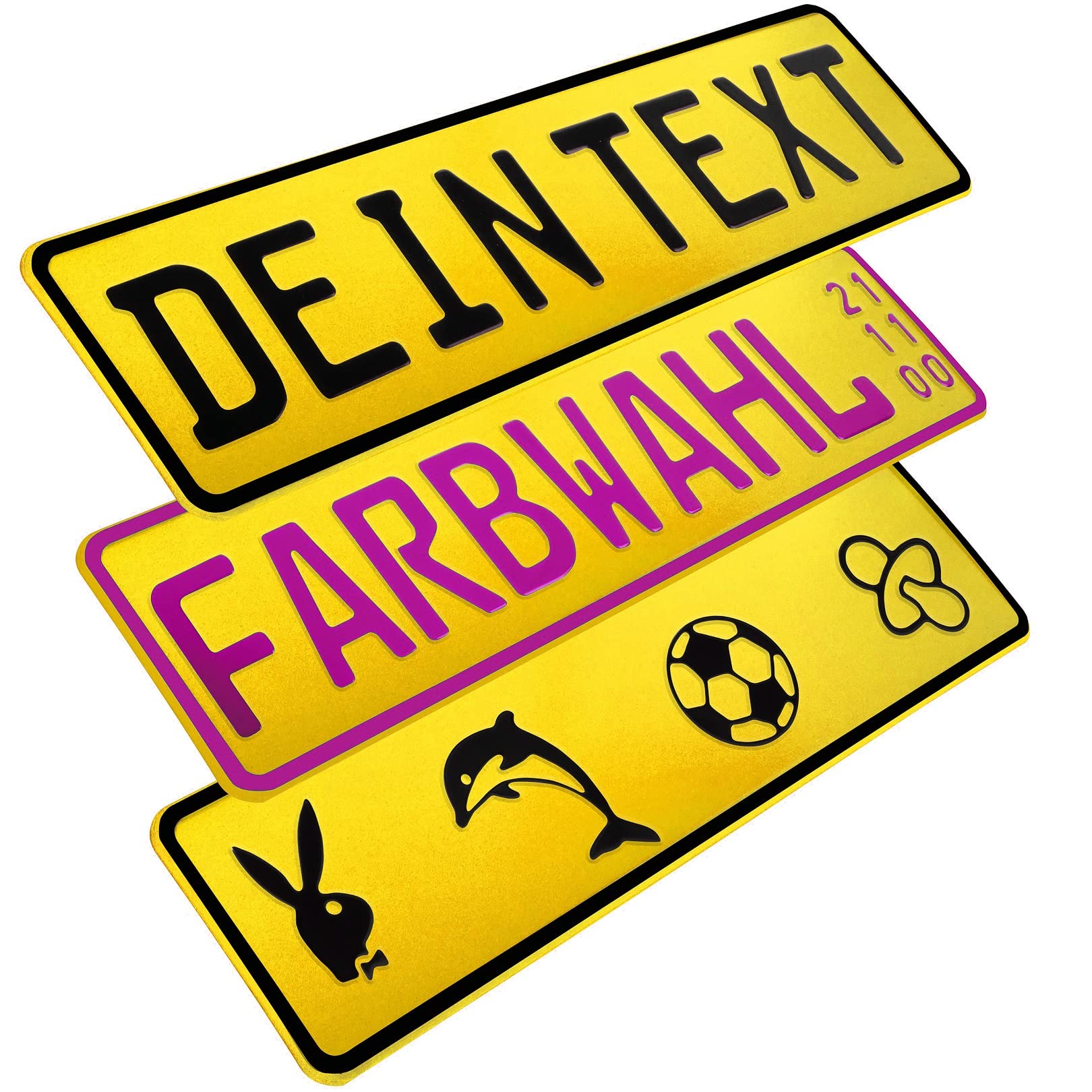 L & P Car Design FKZ 1 Stück Fun Kennzeichen 52cm x 11cm Wunschtext Bohrung Beschichtungsfarbe Individuell Wunschkennzeichen Wunschprägung Namenskennzeichen Namensschild Farbe GELB