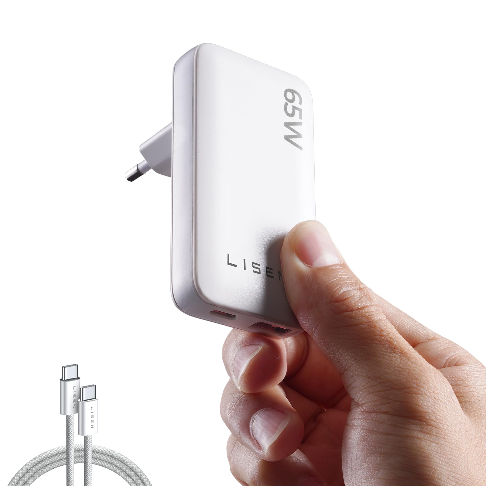 LISEN 65W USB C Netzteil Flach mit EU/US Stecker GaN USB C Ladegerät 65W Schnellladen mit 60W Kabel USBC Schnellladegerät kompatibel mit MacBook Air, iPad, iPhone 17/16/15 1m Perlweiß