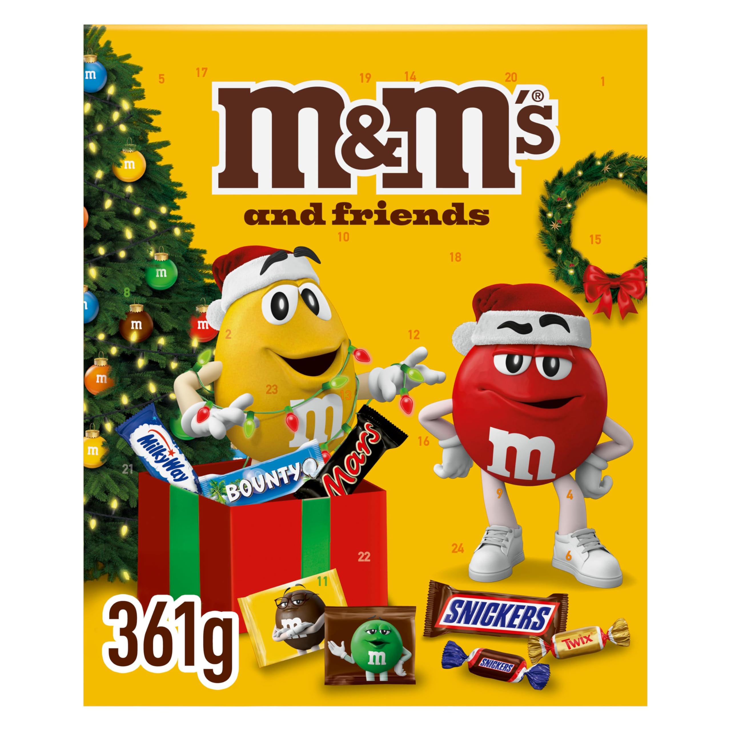 M&M'S & Friends Adventskalender mit einem neuen Schokoriegel-Mix aus M&M'S, Bounty, Mars, Milky Way, Snickers und Twix. Voller Schokolade und Nuss für knackigen Genuss.