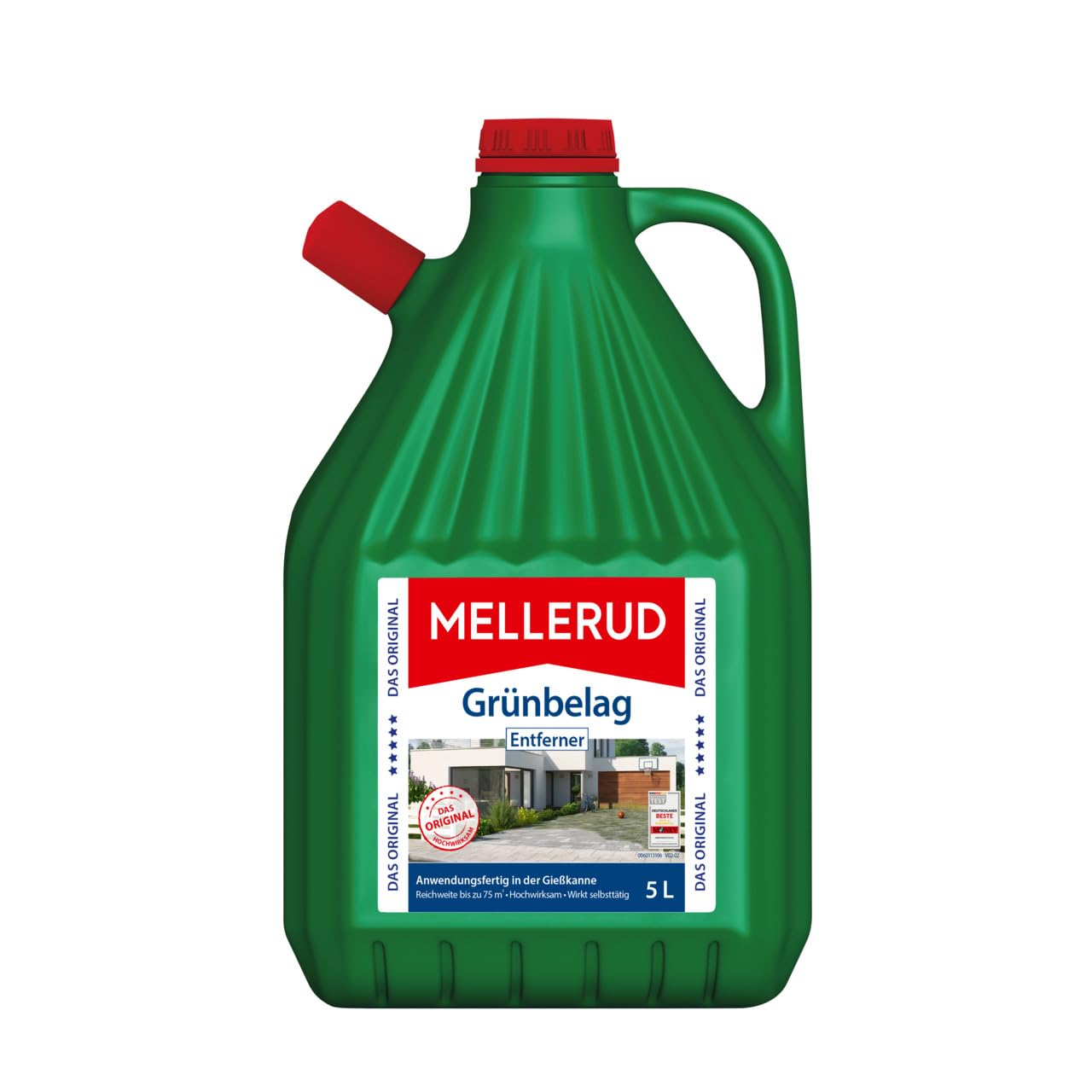 Lieferumfang: 1 x 5 l MELLERUD Grünbelag Entferner / Anwendungsfertiges Mittel für große Flächen im Außenbereich / Braune Verfärbung zeigt den Wirkungseintritt an