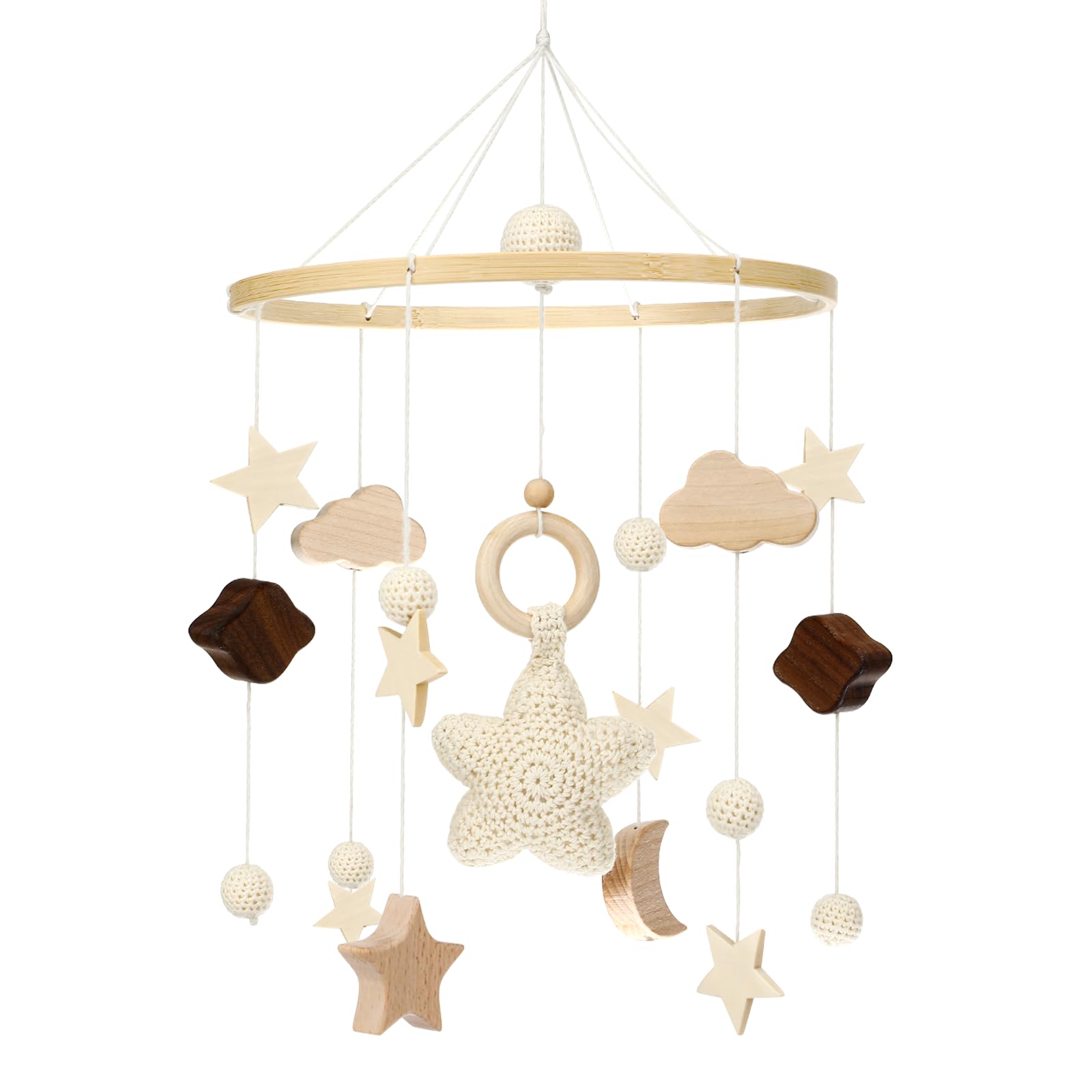 Mobile babybett,Mit gehäkelten Sternen, Monden und Wolken hängenden Dekorationen Baby Mobile für das Bett Holz Mobile Baby Windspiel,Geschenk für Baby Mädchen oder Jungen(A), Beige