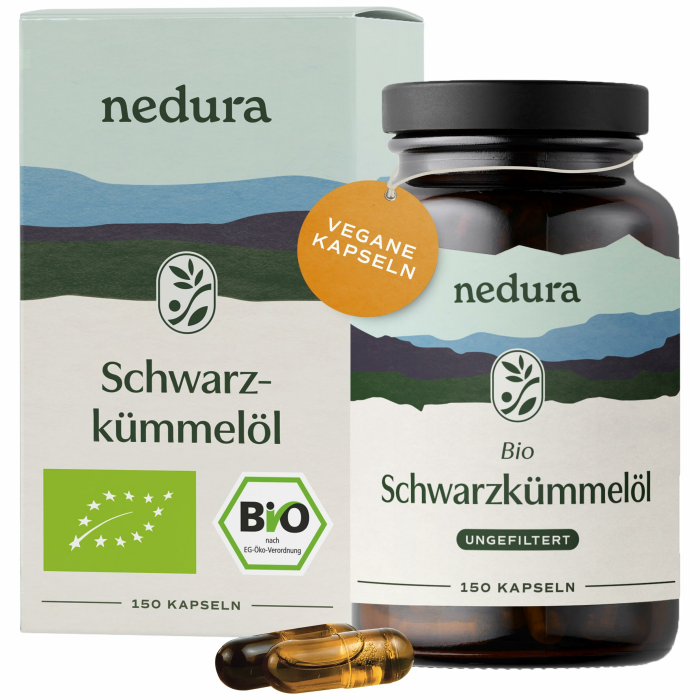 nedura® BIO Schwarzkümmelöl Kapseln (ungefiltert) 150 Stück in veganer Kapsel – BIO-Schwarzkümmel aus Ägypten in eigener Deutscher Manufaktur kaltgepresst & schonend verarbeitet – 1000 mg Tagesdosis 150 Kapseln