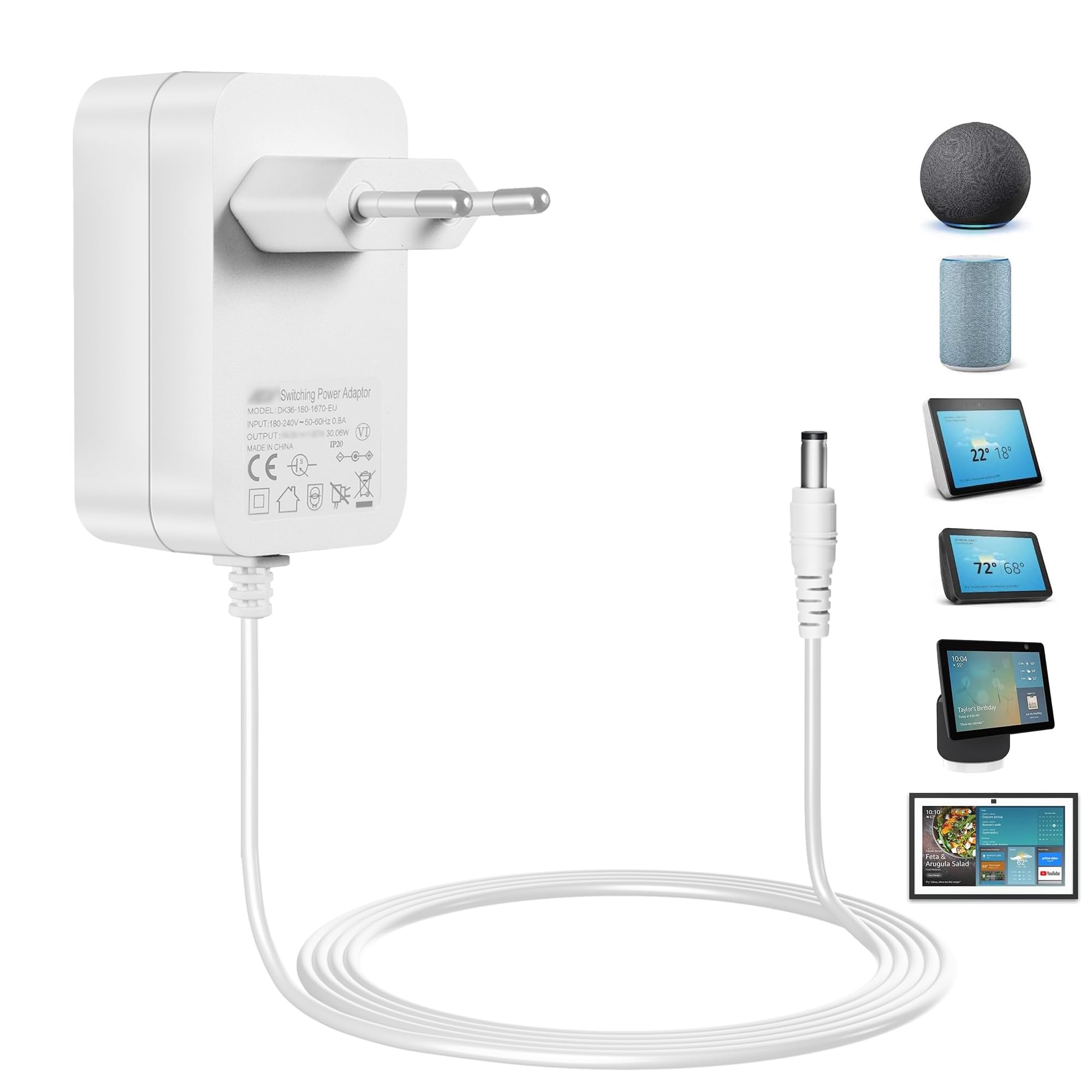 Netzteil für Echo Show 8, Echo Show 10 (3. Gen.), Echo Show 15, Echo Show 21, Echo(3./4. Gen), Echo Show (2. Gen.), Echo Plus (2. Gen) Ladegerät, 30W 18V 1.67A Ladegerät,1.8M Netzkabel, Weiss 30W Netzteil