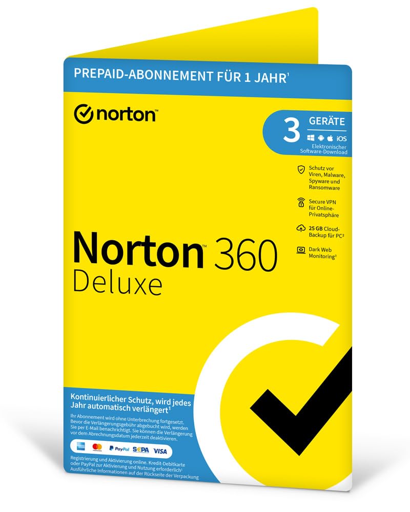 Norton 360 Deluxe 3 Geräte / 1 Jahr | Antivirus | Internet Security | Secure VPN | Passwort-Manager | Firewall | PC/Mac/Android/iOS | Aktivierungscode per Post