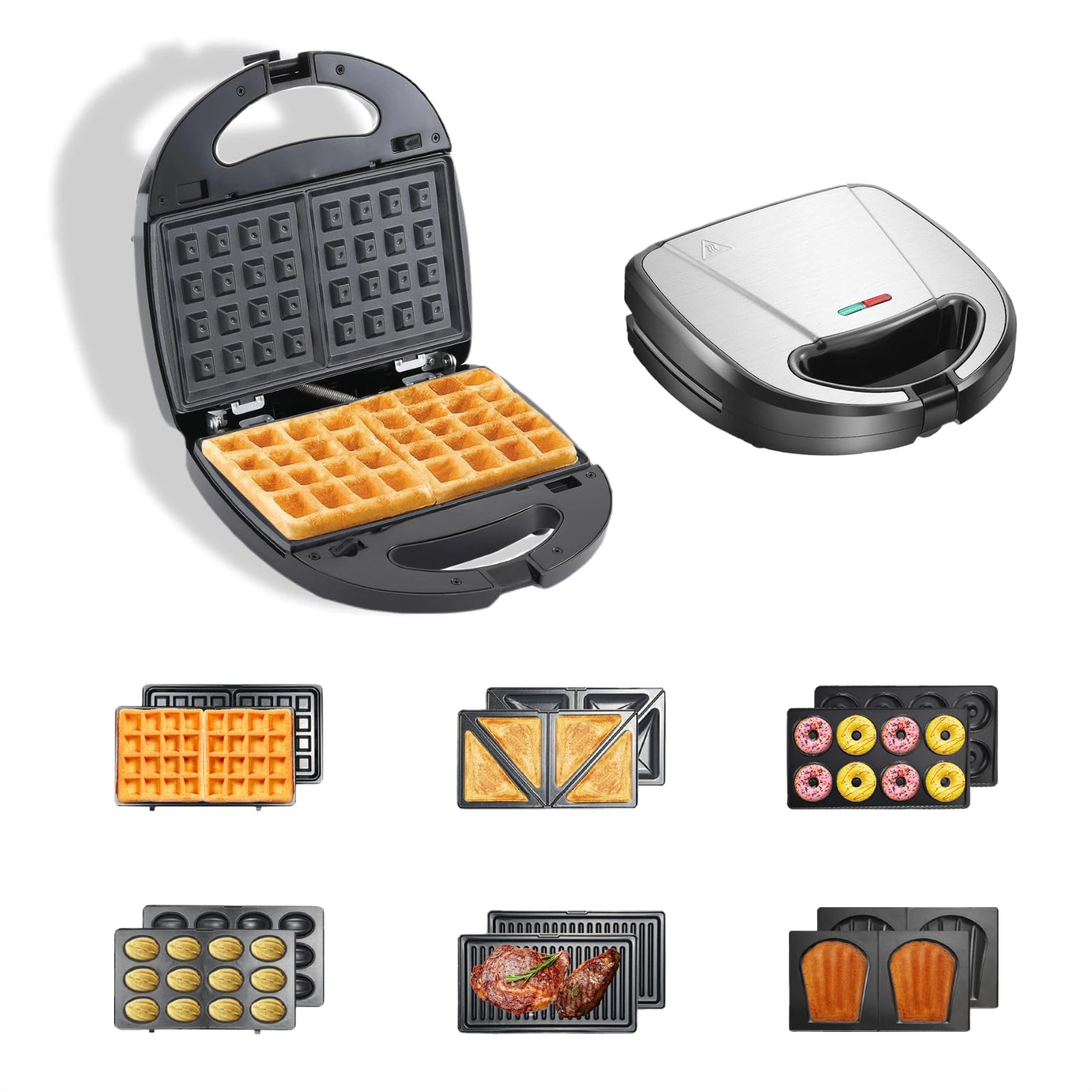 【6 Backbleche zur Auswahl】:Unser Multifunktions-Sandwichmaker bietet 6 austauschbare Platten (Waffeln, Steak, Donuts, Sandwiches, Madeleines, Nüsse). Perfekt für vielseitige Frühstücksideen!