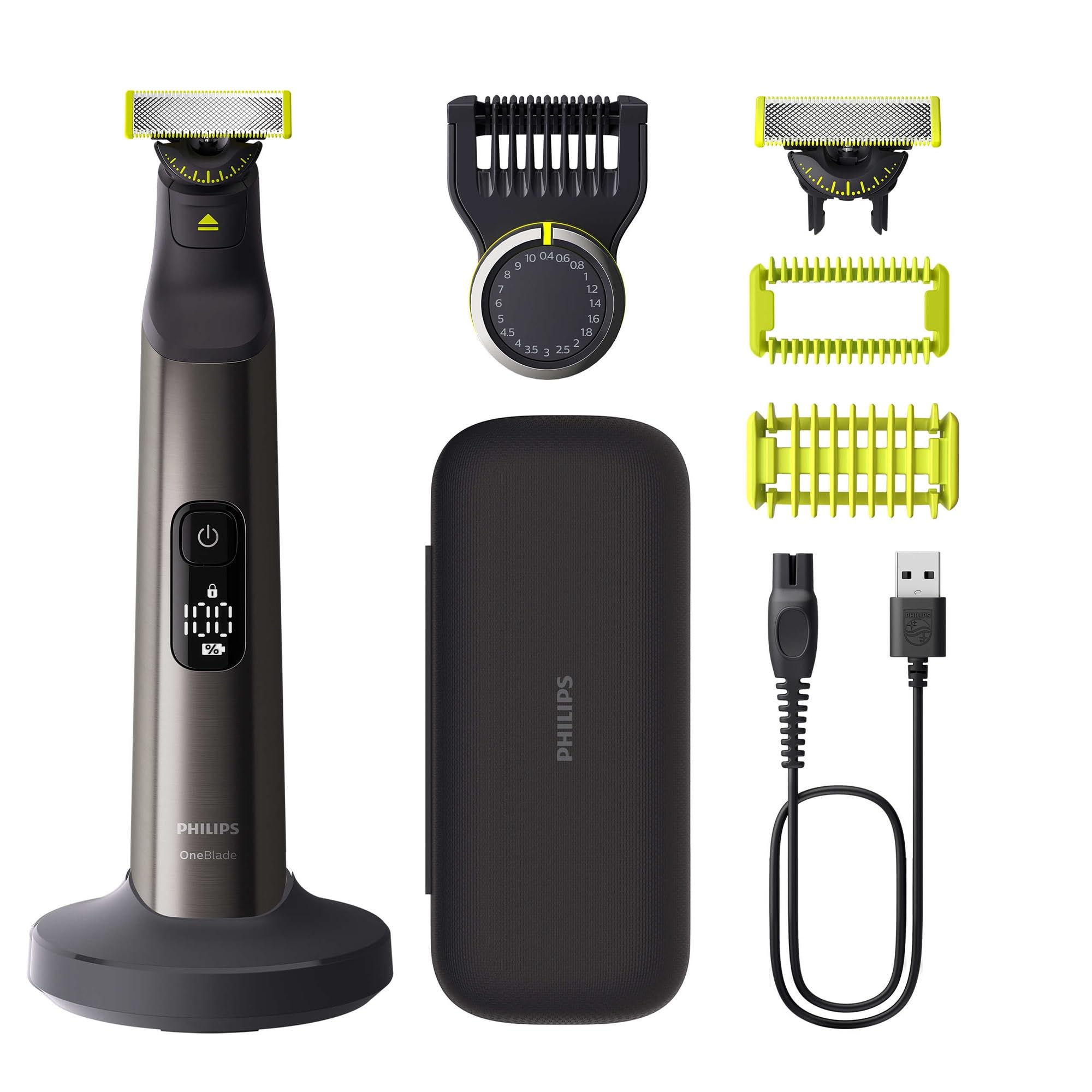 Das Set enthält: 1x Philips OneBlade Pro 360 Face & Body, 2x 360 Klingen, 1x Präzisionskamm mit 14 Längen (0,4-10 mm), 1x Body Kit (1x Click-on-Körperkamm und 1x Hautschutz), 1x Ladestation, 1x Reiseetui