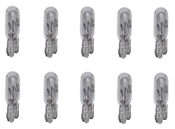 Die praktischen Miniatur-Glassockellampen im 10er Set. Im Set sind zehn Glassockellampen mit einem T5 Sockel (W2X4,6D) enthalten.