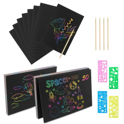 【Paket Inhalt】50 x Kratzbuch, Größe 19 x 13 cm, 5 x Holzstifte, 4 x Zeichenvorlagen, kann in Schultaschen und Rucksäcke gesteckt werden, leicht zu tragen.