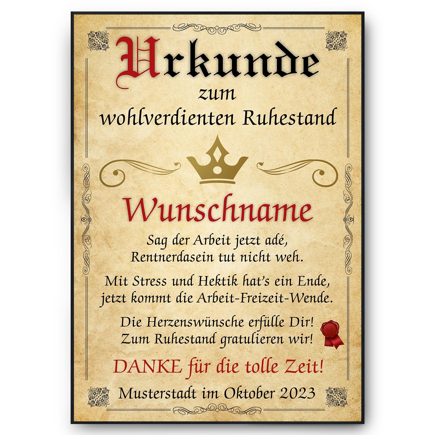 Ruhestand Urkunde personalisiert Rente persönliches Abschiedsgeschenk Kollegen personalisierte Geschenkidee zum Ruhestand