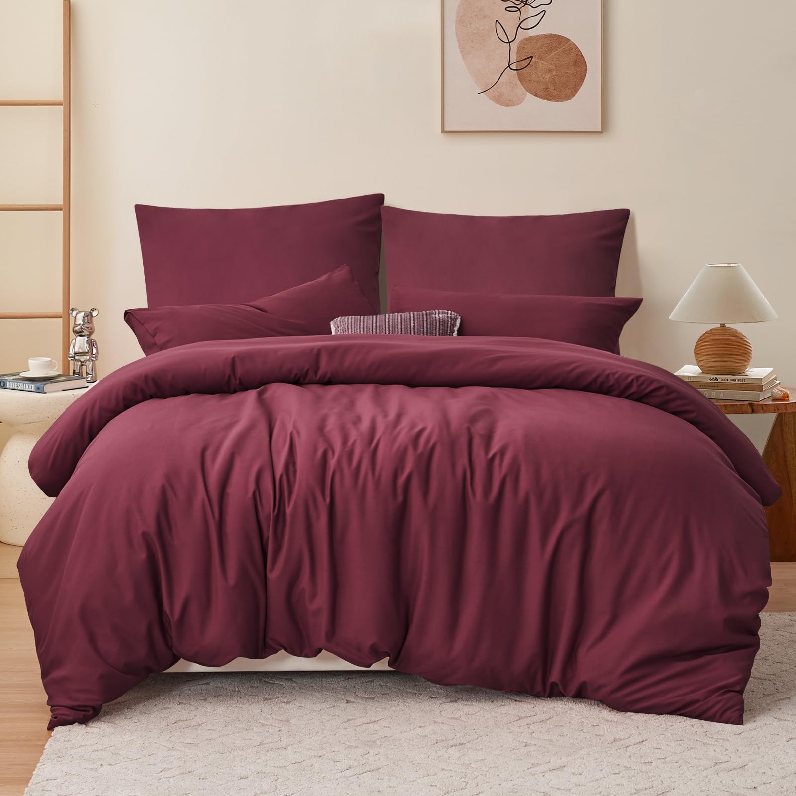 Die Bettwäsche 200x220 3teilig (Lieferumfang: 1 Bettbezug 200x220cm+2 Kissenbezüge 80x80cm) mit glatter Oberfläche und feiner Haptik wird aus Mikrofaser gefertigt und fühlt sich dadurch sehr angenehm auf der Haut an, da sie besonders weich und hautfreundlich ist, womit Sie eine erholsame Nachtruhe genießen können. Das Bettwäsche Set eignet sich aufgrund der Atmungsaktivität und der Wärmeregulierung sowohl für Sommer als auch für die Winter Nächte und kann damit ganzjährig genutzt werden. Außerdem lässt die Bettwäsche sich durch die feinen Fasern ihre Form kaum verändern und weist eine gute Strapazierfähigkeit auf. Die Bettwäsche 220x200 präsentiert sich im schlichten Design und ist in mehreren trendigen Unifarben gestaltet, dadurch finden Sie je nach Einrichtungsstil ganz leicht eine passende Bettwäsche. Sie setzt auch stilvolle Akzente ins Schlafzimmer und verleiht eine wohnliche Atmosphäre. Ausgestattet mit hochwertigen Reißverschlüssen lassen sich die Kissen- und Bettbezüge schnell auf- und abziehen. Zudem sind praktischen Bändchen an den 4 Ecken angenäht, mit denen wird Ihre Decke an der richtigen Stelle befestigt und das ungewolltes Verrutschen im Bettbezug vermieden. Die Bettwäsche 200x220 burgunderrot lässt sich für hygienische Reinigung bei bis zu 60℃ waschen und ist selbstverständlich auch trocknergeeignet. Bei Fragen oder Unterstützungsbedarf steht Ihnen unser Kundenservice jederzeit zur Verfügung.