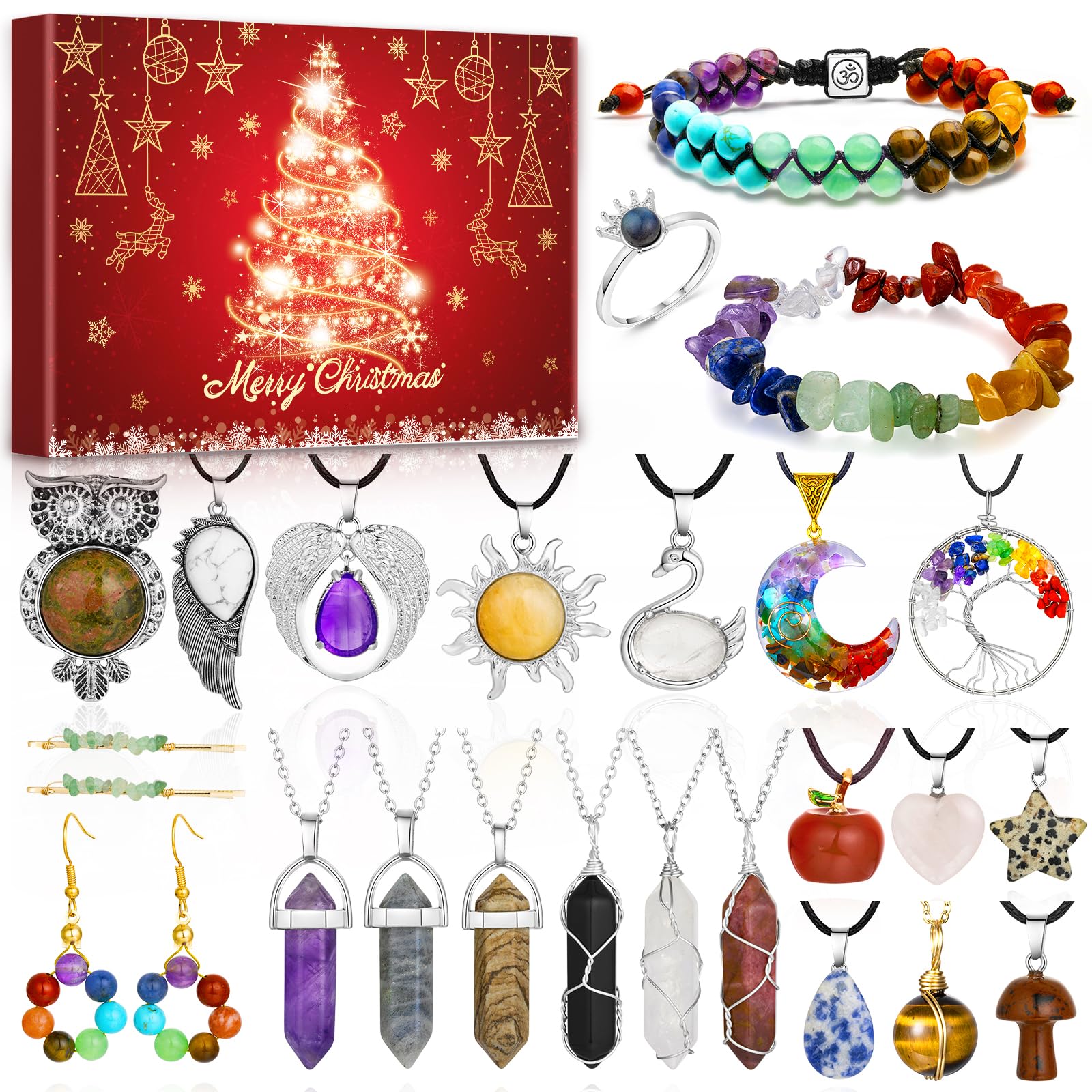 【Calendrier De l'Avent 2025 Pour Femme】Ce calendrier de l'Avent pour Femme contient 24 bijoux en pierres naturelles, telles que le quartz clair, l'améthyste, l'œil de tigre et la rhodonite. Il comprend 18 colliers et 2 bracelets, une paire de boucles d'oreilles, une paire d'épingles à cheveux, une broche et une bague. Il comprend également une pochette de rangement pour pierres précieuses et des instructions en français décrivant leurs propriétés. Comptez les jours jusqu'à Noël avec notre collection de bijoux, laissez votre charme s'épanouir couche après couche avec l'ambiance festive !