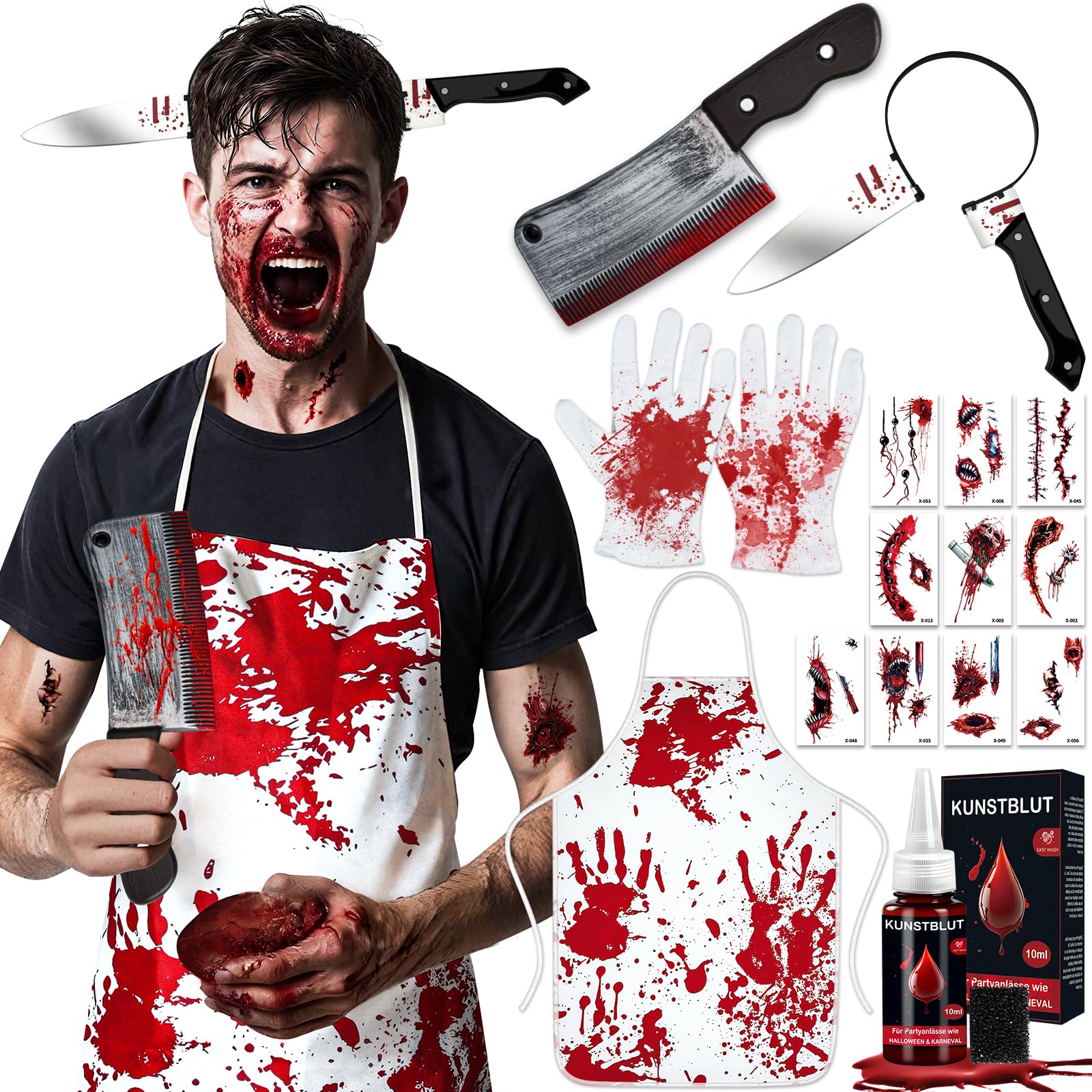 SYNERIX Halloween Kostüm Damen Herren Gruselig - Metzger Kostüme Halloween Männer Costume Erwachsene Horror mit 10ml Kunstblut, Messer mit Blut, Haarreif Messer, Handschuhe und 10 Halloween Tattoos