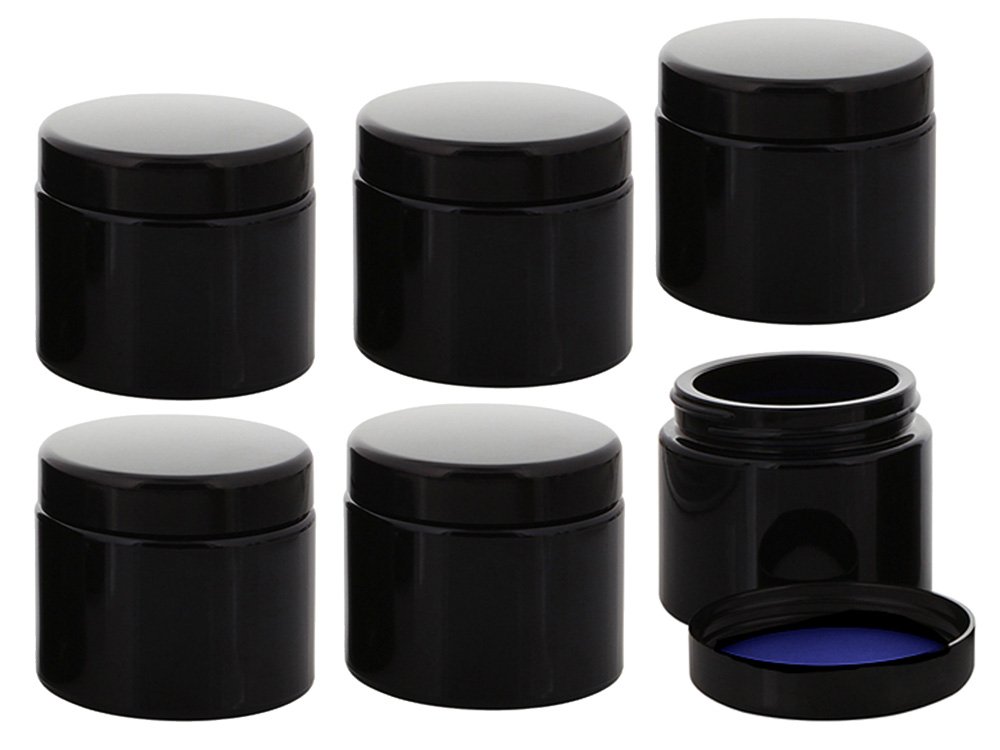 Violett Miron Glas-Tiegel 50ml mit Deckel Schwarz, Leere Kosmetex Glas Creme-Dose, Kosmetik-Dose Mironglas Violettglas, 6x Deckel-Schwarz