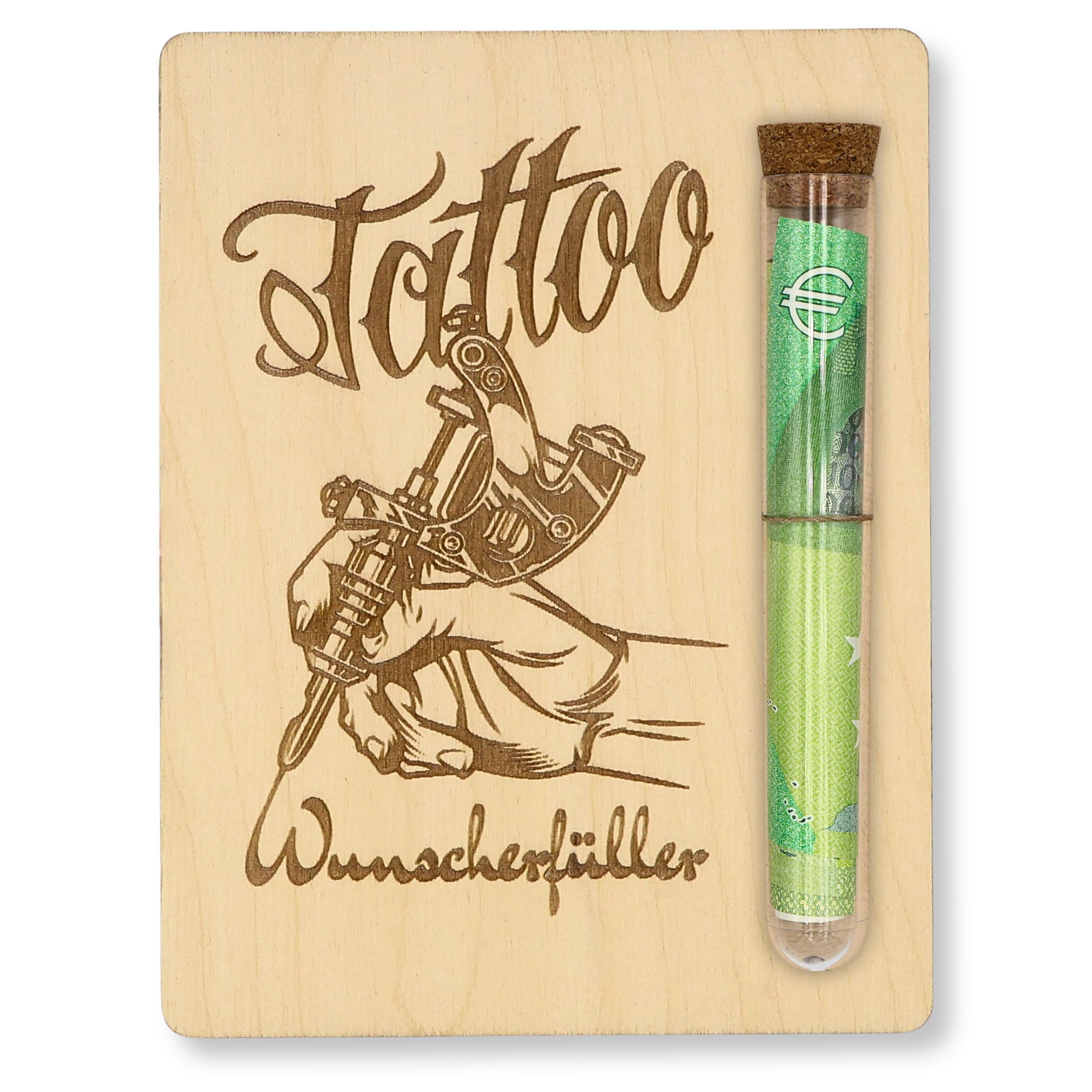 ZUKLA Verpackung für Geldgeschenke Tattoo/Tätowierung - 13 x 10 cm - mit Reagenzglas - Originelles Holz Geldgeschenk - Tattoo Gutschein Geschenkbox